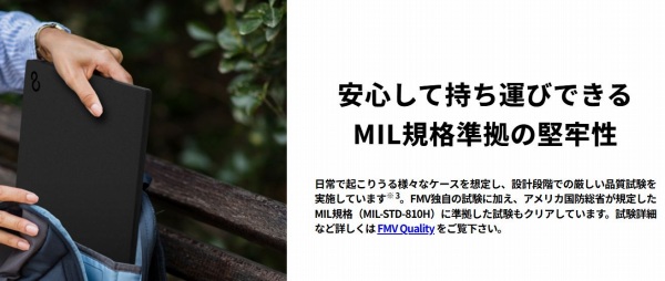 軽量モデルの場合、堅牢性が気になりますが、本モデルは米軍MIL規格、FMV独自の堅牢性試験もクリアしています。