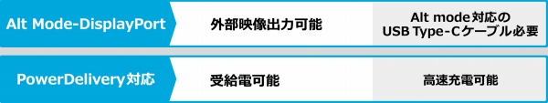 Type-C端子は2つともDisplayPort/PowerDeliveryに対応しているため、映像出力/受給電が可能。