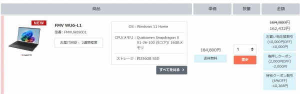 FMV WU6-L1(FMV Zero)にシークレットクーポンを適用すれば、通常価格よりも割引されるお得なキャンペーン実施中です(今回のクーポンは当サイト向け特別クーポンです。クーポンの割引率が変更になったり、クーポンの発行自体が終了する可能性もあるのでご注意ください。また価格コムやポイントサイトでは基本的に活用できないクーポンコードです)。
