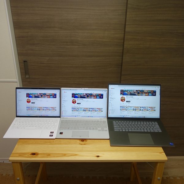 13インチ/16インチPCを並べてみました(左:13.3インチPC/真ん中:レビュー機(14インチPC)/右:16インチPC)。