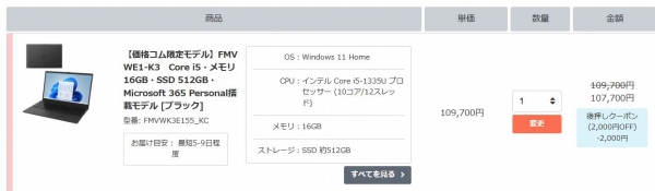 この記事執筆時点でMicrosoft 365(Office)付きの最小構成で10万円を切っており、富士通の15インチノートとしてはお求めやすい構成になっていると思います。