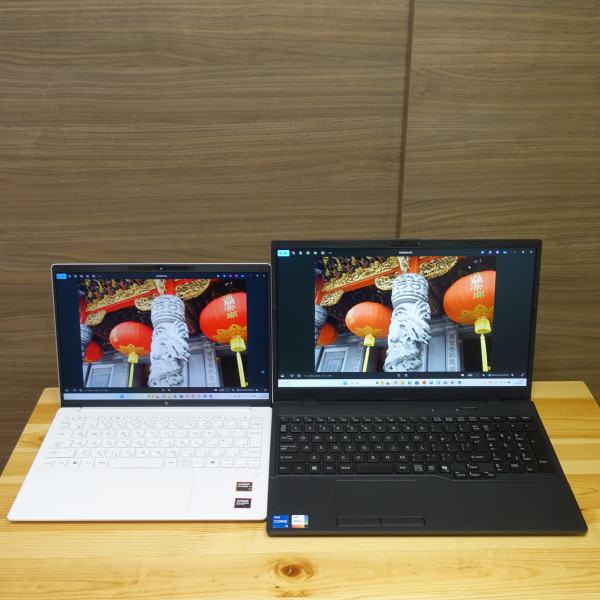 縦横比16:9のパネルが採用されており、最近主流の16:10のパネルと比べると縦方向の表示領域が狭くなっています。その分、ボディはコンパクトにすることができるんですけどね(上の画像の左:レビュー機(15.6インチ/縦横比 16:9)/右:16インチノートPC(縦横比16:10))。