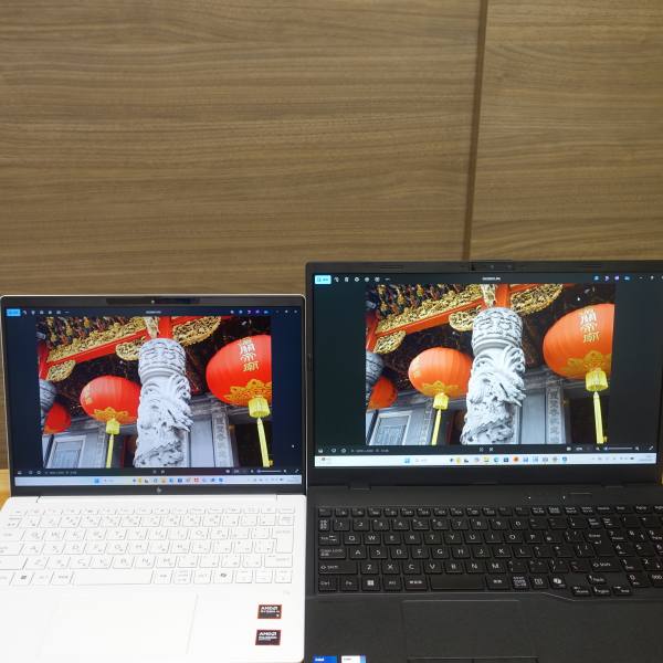 パネルの色域はちょっと狭め。色域の広いsRGB100%のパネルを搭載した13インチノートPCに同じ画像を映し出したところ(上の画像の左:sRGB100%の13インチノートPC/右:レビュー機(16インチ))。