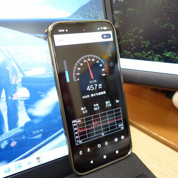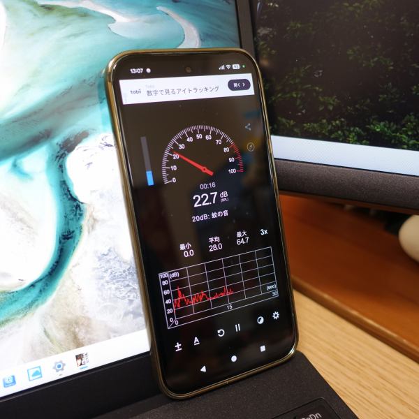 ファンの音をスマホの騒音計アプリで計測してみました。僕が使った限り、ネットを見るなど一般的な使い方をしているときは20-30dB程度でファンの音がほとんど聞こえてこず静か。