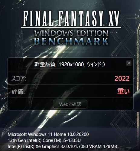重い負荷のかかるFF15ベンチマークの結果は「軽量品質」で「重い」、「標準品質」で「動作困難」。