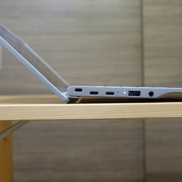 左側面部。USB Type-C×2、ステータスランプ、USB Type-A、マイク/ヘッドホンコンボ端子を配置。USB端子はType-Aが2個とType-Cが2個の合計4個搭載しています。