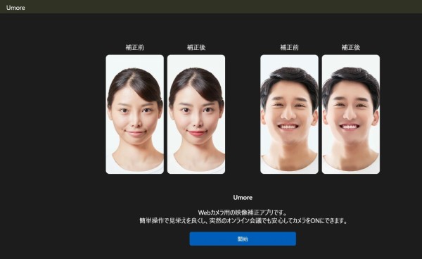 Umoreという映像補正アプリが同梱されており、 カメラ使用時の見た目の印象を良くすることができます。