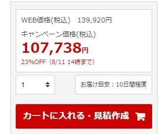 このときは、23%オフのキャンペーンが用意されていました。Web価格139,920円に対し、23%オフが適用されて107,738円となっています。