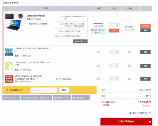 クーポンの利用法はすごく簡単です。富士通Webマートの該当製品のページにアクセスした後、購入時に専用クーポンコードを入力して適用するだけです。登録等の手間はかかりません。クーポンコードはすべてのモデルで同じです。