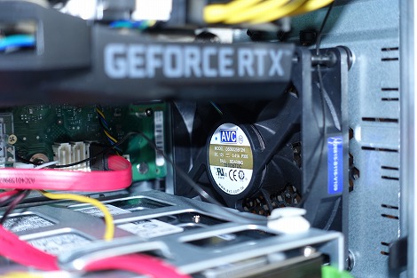 PCIスロットが配置されています。 PCI Express x16×1、PCI Express x2×1、PCI Express x1×2が搭載されています(PCI Express x16はNVIDIA GeForce RTXグラフィックスカードの接続に使用されています)。