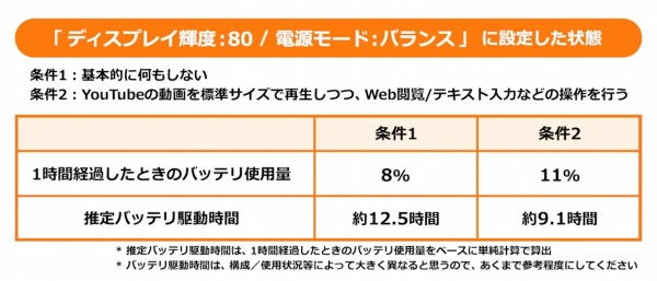 UQのバッテリ駆動時間を実際に計測してみました。 条件1の何もしない状態、条件2の動画再生した状態とも約20時間バッテリが駆動する計算です(バッテリ駆動時間は、構成/使用状況等によって大きく異なると思うので、あくまで参考値としてください)。