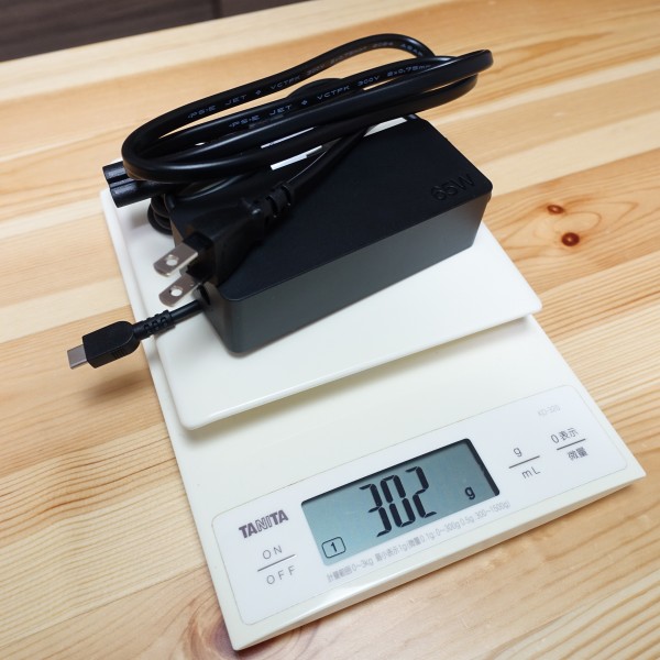 ACアダプタと電源ケーブルを合わせた重量は302g。