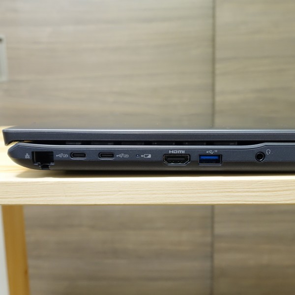 LAN端子、USB Type-C×2、ステータスランプ、HDMI、USB Type-A、マイク・ヘッドホンコンボ端子を配置。