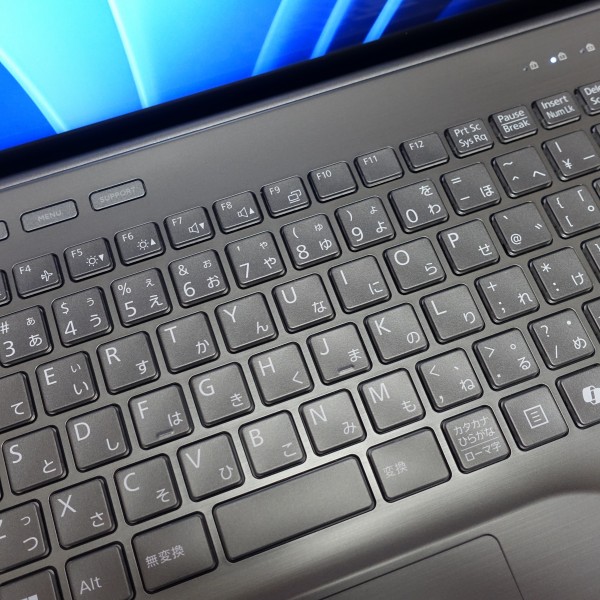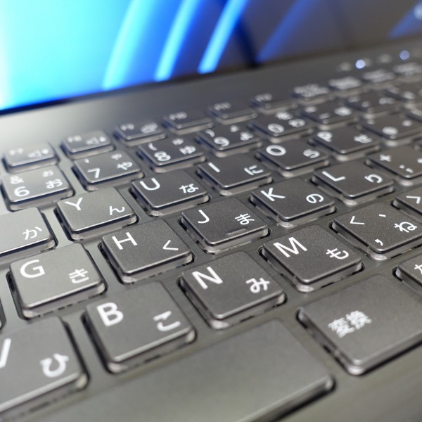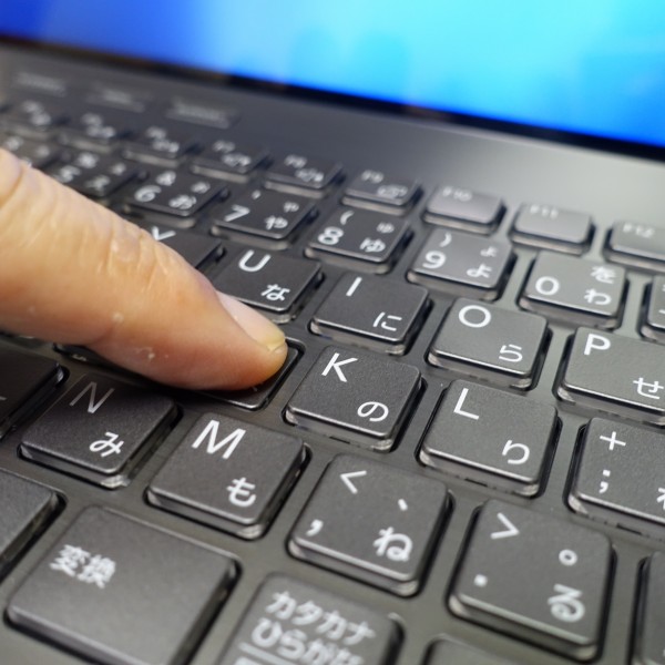 キーストローク(キーを押し込む深さ)は約2.5mm。 標準的なノートPCは1.3-1.5mm程度なので、すごく深めです。キーを強く押してもボディのたわみはあまり気になりませんでした。