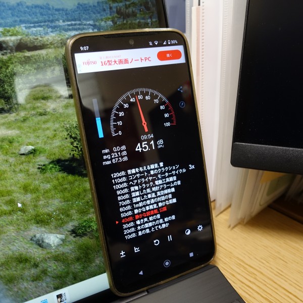 FF15ベンチマーク実行時、45dB程度。ファンの回転音が結構聞こえてきます。高い負荷がかかったとき、他のPCの場合30-35dBが多いので、ちょっと音が気になるかもしれません。