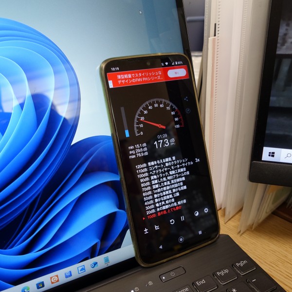 ファンの音をスマホの騒音計アプリで計測してみました。 ネットを見るなど一般的な使い方をしているときは17-20dB程度ですごく静か。ほとんどファンの音が聞こえてきません。