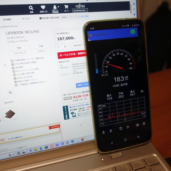 ファンの音をスマホの騒音計アプリで計測してみました(スマホのアプリなので数値が正確ではない可能性があります」)。ネットを見ているときの音は18-22db程度で静か。ほとんどファンの音が気になりません。