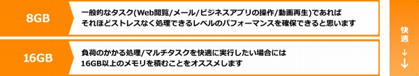 8GBメモリ搭載モデルは価格が安く設定されていますが、 負荷がかかったり、マルチタスクを処理する際に動きが遅くなることあるので、 性能重視なら16GBメモリ搭載モデルがオススメ。