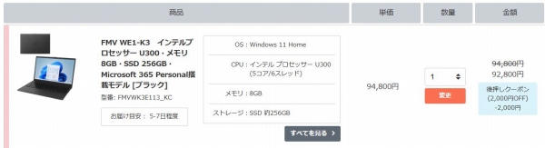 この記事執筆時点の最小構成(インテル300U/8GBメモリ/256GB SSD/Microsoft 365付き) の価格が92,800円(税込)(クーポン適用時/価格コム限定モデル)。 Microsoft 365 Personal(24か月版)が標準で付いていいて、この価格設定は結構お得ですね。 ネットを見る・動画を再生するといった、比較的負荷が軽いタスクがメインで価格重視ならこの構成でもありだと思います(直近の価格については直販サイトをご参照ください)。