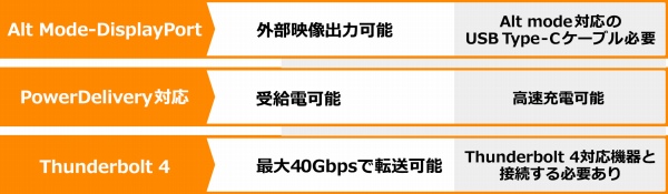 2つあるType-Cのうちは右側面部の端子のみDisplayPort、PowerDeliveryに対応しています。どちらもThunderboltには非対応です。