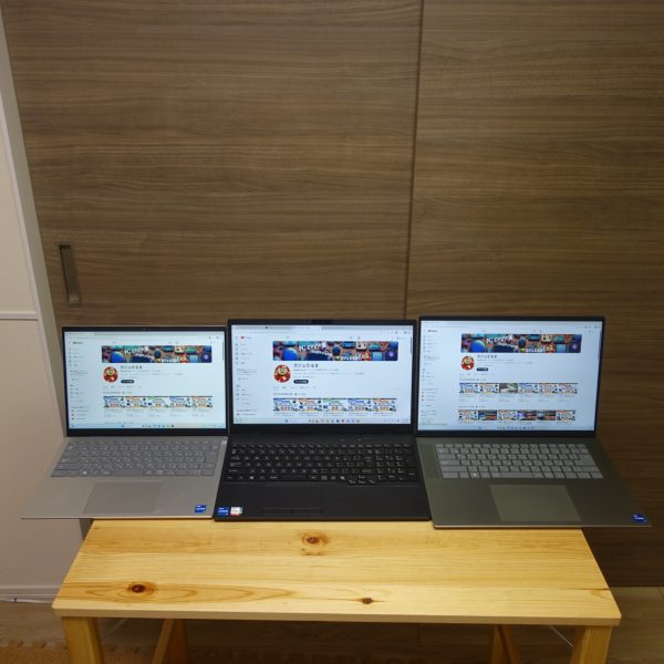 縦横比16:10の14インチ/16インチパネルを搭載したノートPCを並べてみました(上の画像の左が14インチPC、真ん中がレビュー機(15.6インチ)、右が16インチノートPC)。