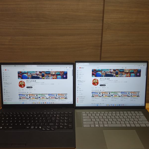 縦横比16:9のパネルが採用されており、最近主流の16:10のパネルと比べると縦方向の表示領域が狭くなっています。その分、ボディはコンパクトにすることができるんですけどね(上の画像の左:レビュー機(15.6インチ/縦横比 16:9)/右:16インチノートPC(縦横比16:10))。