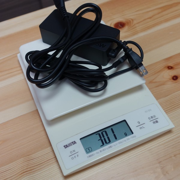ACアタプタと電源ケーブルを合わせた重量は301g。
