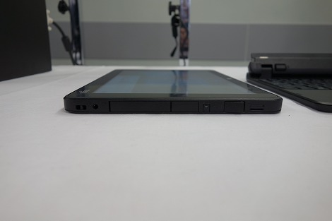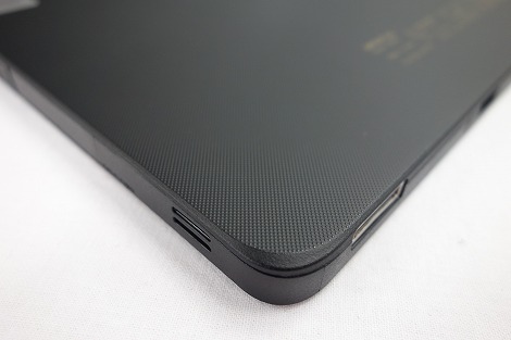 搭載している端子類は、microSDメモリーカード対応スロット、USB3.0準拠×1(左側面)、USB2.0準拠×1(右側面)、microHDMI出力端子、ヘッドホン・ヘッドセット兼用端子。タブレットとしては豊富なインタフェースを搭載していると思います。