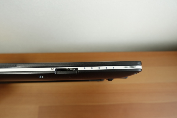 前面部にメモリースロットが配置されているので、SDカードの出し入れがしやすいです。SDカードをスロットに挿入してみたところ、ほぼカード全体が収納されました。