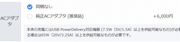 なお僕が確認したところ、全モデルでACアダプタは同梱されておらず、純正ACアダプタ(推奨品)をオプションで選択する必要があるのでご注意ください