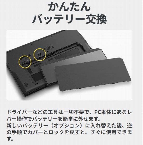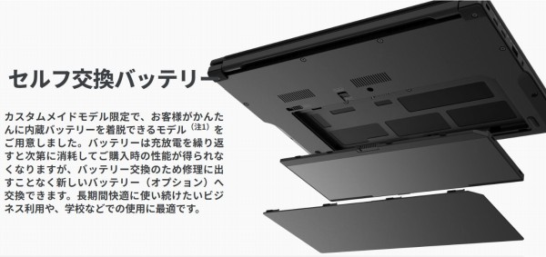 またおもしろいのが、セルフ交換式のバッテリを搭載している点。購入時に47Wh/63Whを選ぶことができます。