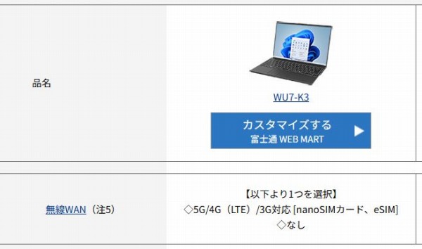 - 3)FMV WU7-K3(5G対応選択可能/バッテリ着脱式)