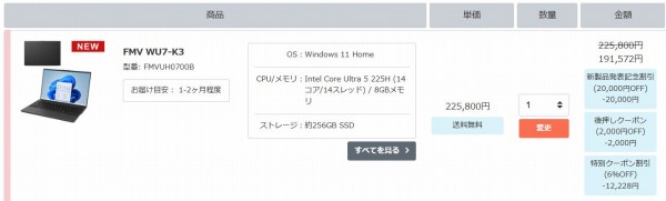 価格はCore Ultra 5 225H/8GBメモリ/256GB SSD/47Whバッテリの構成が153,972円(税込)。バッテリ着脱式のためか、バッテリ容量の多いWU4-K3よりも価格が高めに設定されています。