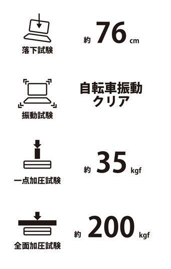 これだけコンパクト/スリム/軽量だと、堅牢性が心配になりますが、各種テストをクリアしており、安心して外に持ち出すことができます。