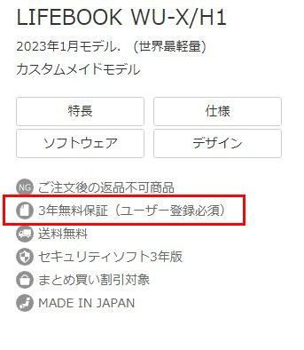 また富士通カスタマイズモデルの場合、通常1年間の標準保証が3年間に延長されます(ユーザー登録が必要)。