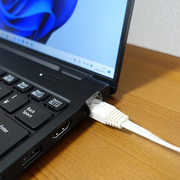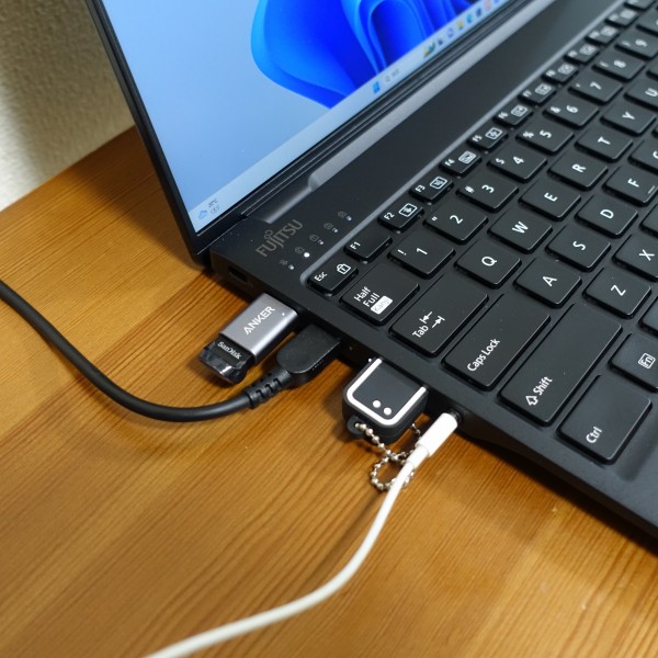 左右の側面部のすべての端子類にケーブル・デバイスを接続してみました。本体手前側に端子類が配置されていないので、タイピング時にケーブル類が邪魔になるケースは少ないと思います。