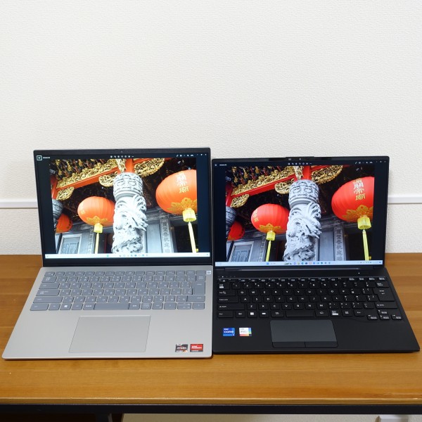 一般的な14インチノートと比べてみました。上の画像の右がレビュー機です。同じサイズの14インチパネルを搭載していても、レビュー機の方がコンパクトですね。