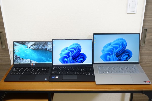 上の画像の左は13.3インチノート(縦横比16:9パネル)、真ん中はレビュー機(14インチ/16:10パネル)、右は16インチノート(16:10パネル)。13.3インチからは一回りパネルが大きくなっていますね。16インチはかなり大きいです。