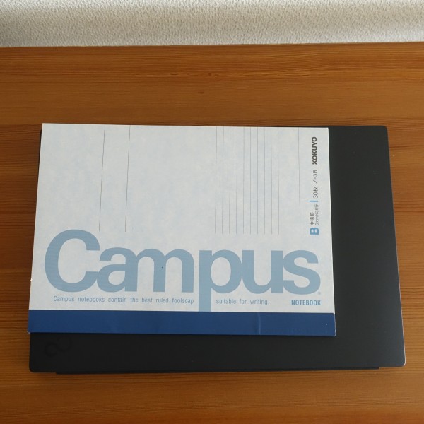 重さもレビュー機が681gなのに対し、こちらの14インチノートは約1.5kg。レビュー機は半分弱の重さしかありません。圧倒的な軽さです。