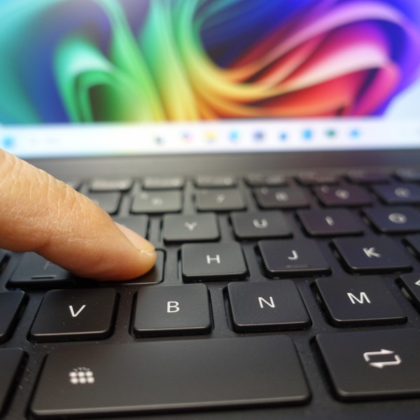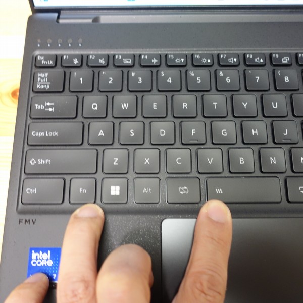 キーボード上部も少し温かいですが、パームレストに熱はほとんど感じませんでした。スリム・軽量PCですが、冷却はうまくいっている印象です。