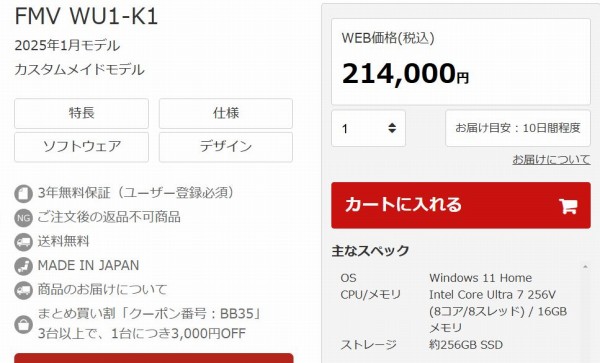 直販モデル(WU1-K1)の最小構成(Core Ultra 7 256V/約16GBメモリ/約256GB SSD)はOfficeなしで214,000円(税込)。負荷が軽めのタスクがメインならこの構成でも十分だと思います。