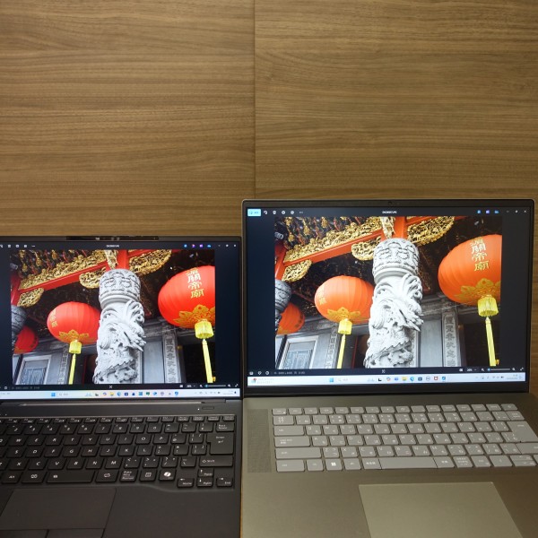 色域は広め。色域の狭いパネルを搭載した16インチPCに同じ画像を映し出してみました(上の画像の左:レビュー機/右:16インチPC(色域の狭いパネルを搭載))。