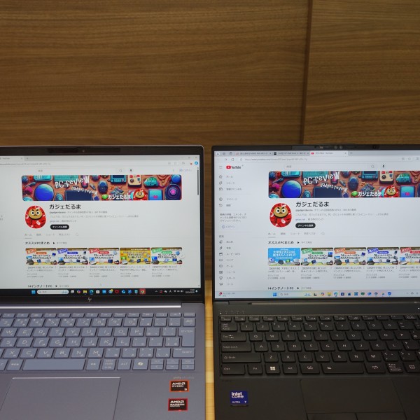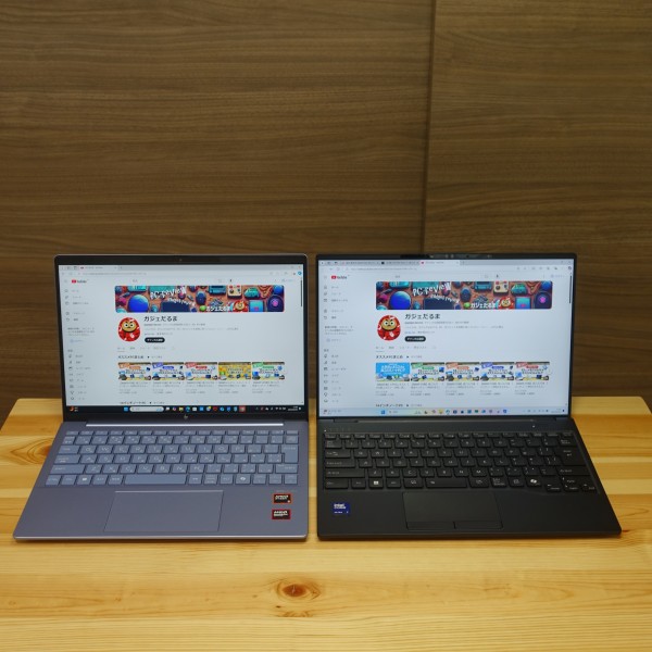 一般的な14インチノートPCを並べてみました。本モデルのコンパクトさがよく分かると思います(左:一般的な14インチPC(縦横比16:10)/右:レビュー機(14インチ/縦横比16:10))。