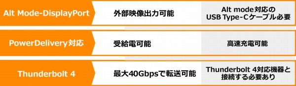 | USB Type-C | Thunderbolt 4 USB4(Gen3)×2 | USB 3.2(Gen2)×2 | Thunderbolt 4 USB4(Gen3)×2 | |