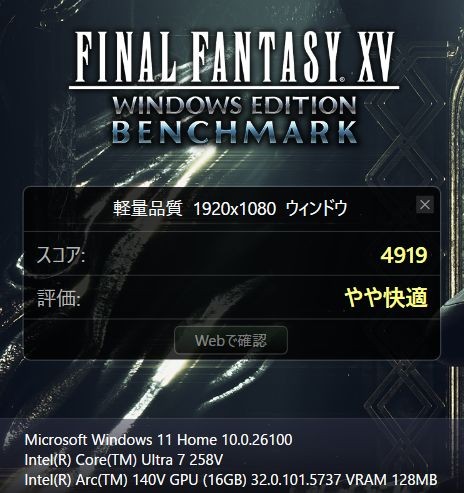 重い負荷のかかるFF15ベンチマークの結果は「軽量品質」で「やや快適」、「標準品質」で「普通」、「高品質」で「やや重い」。こちらも他のPCで計測した同じCPU(Core Ultra 7 258V)のスコアを下回っていますが、Core Ultra 7 155Hよりは若干上回っている感じ。