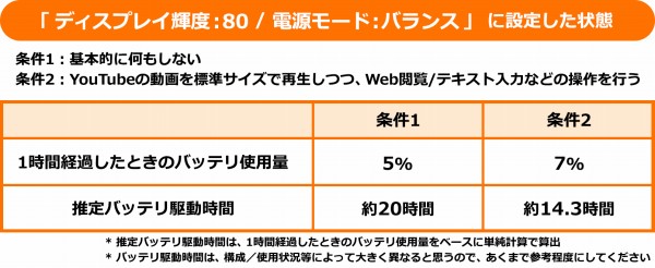 条件1の何もしない状態で約20時間、動画再生した状態で約14.3時間バッテリが駆動する計算です。ある程度、長いバッテリ駆動時間を確保できると思います。