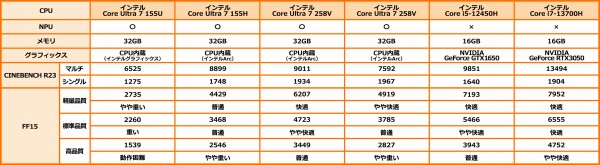 (*レビュー機のスコアは、右から3列目の「インテルCore Ultra 7 258V」です)