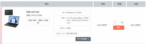 動画撮影時点では、店頭モデル(U77-K3)のCore Ultra 7 155H/16GBメモリ/512GB SSDの構成が263,780円(税込)。Microsoft Officeが標準で同梱されていることもあり、価格は高めに設定されている印象を受けます。