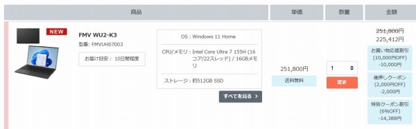 なお、直販モデル(WU1-K1)の構成と店頭モデルの構成を揃えた場合(Core Ultra 7 155H/16GBメモリ/512GB SSD/63Whバッテリ/Officeあり/ACアダプタ付き)、クーポン適用後で225,412円(税込)となり、店頭モデルよりも約38,000円お得です。