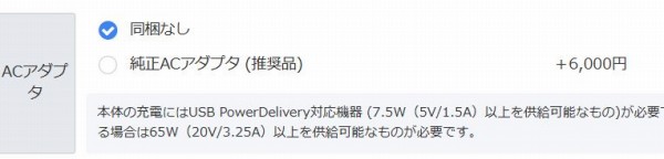 なお僕が確認したところ、店頭モデルにはACアダプタ類は同梱されていますが、直販モデルでは同梱されておらず、純正アダプタ(推奨品)をオプションで選択する必要があるみたいなのでご注意ください。